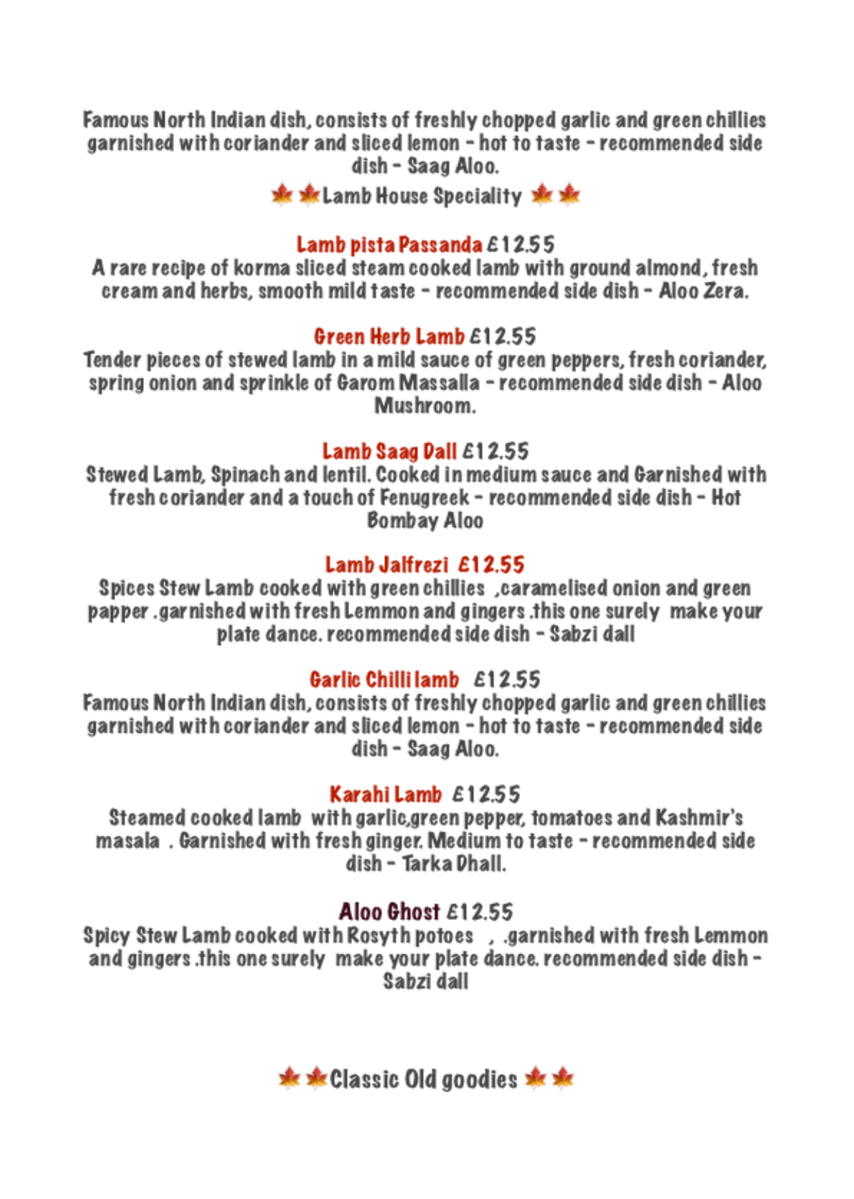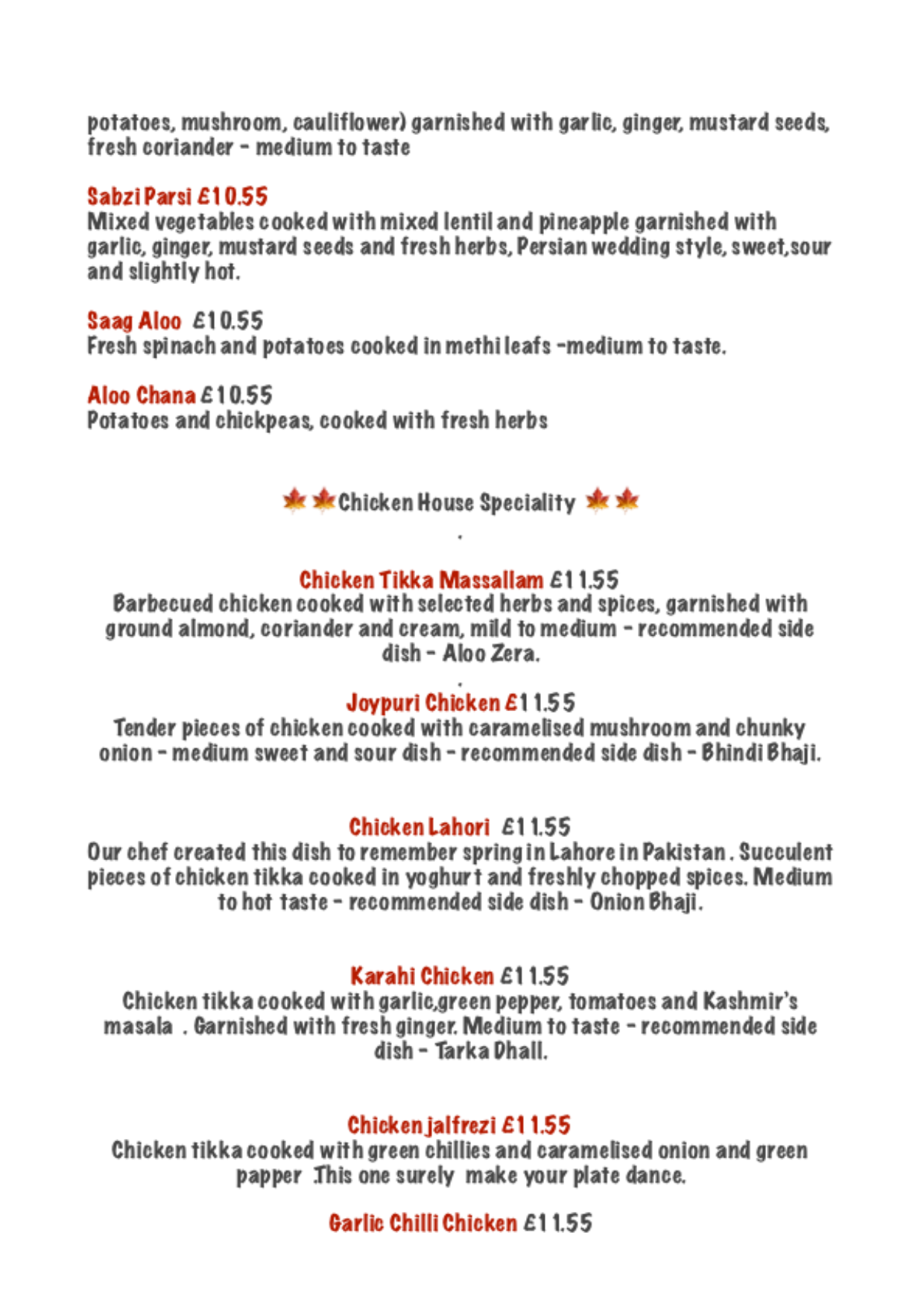Dinein Menu